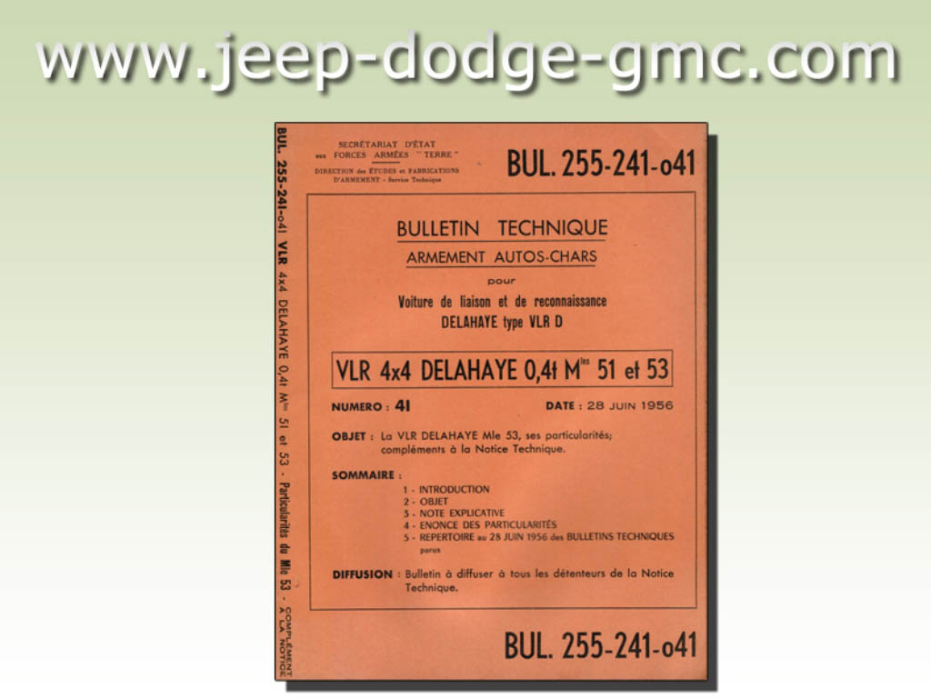 | BUL_255_241_041 | Bulletin Technique VLR 4x4 DELAHAYE 0.4t Models 51 et 53, Juin 1956 (original) |