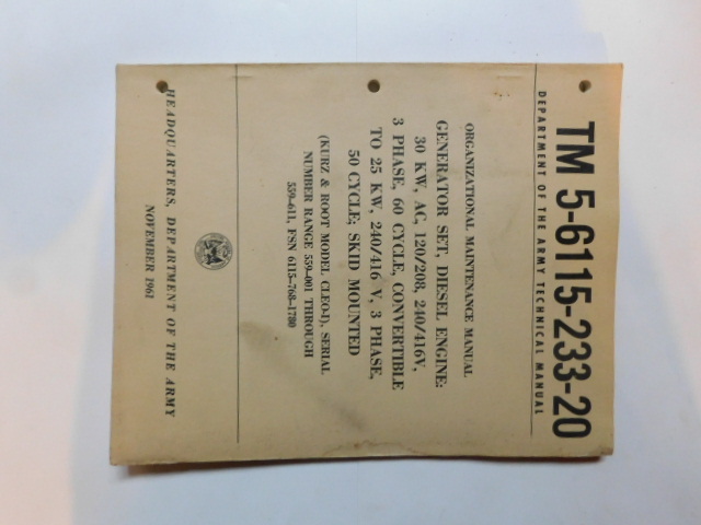 | TM5_6115_233_20 | Manuel Technique, Generator Set, KURZ and ROOT Model CLEO-I, November 1961 |