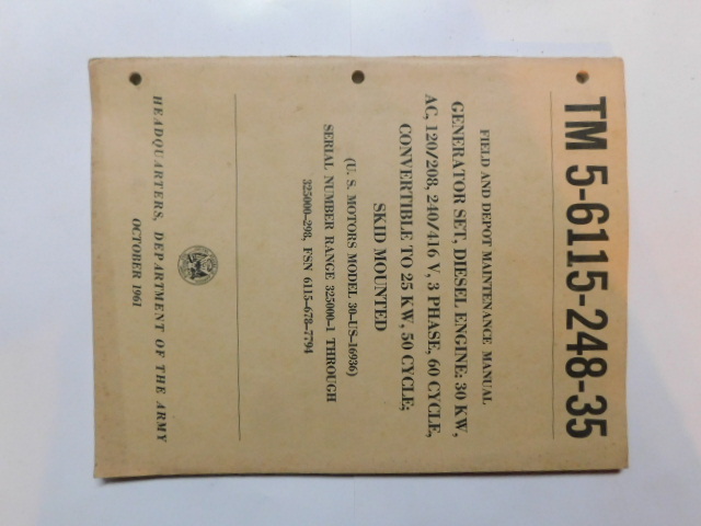 | TM5_6115_248_35 | Manuel Technique Generator Set Diesel Engine US MOTORS 30-US-16936, October 1961 |