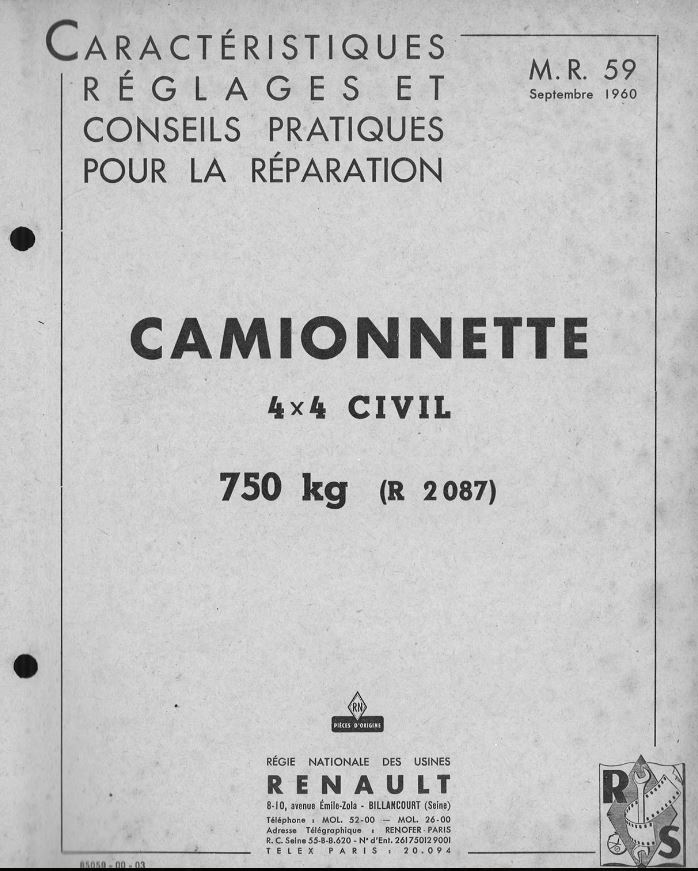 | MR59_COP | Manuel de Reparation, Camionnette 4x4 Civil 75Kg R2087, Septembre 1960 (copie) |
